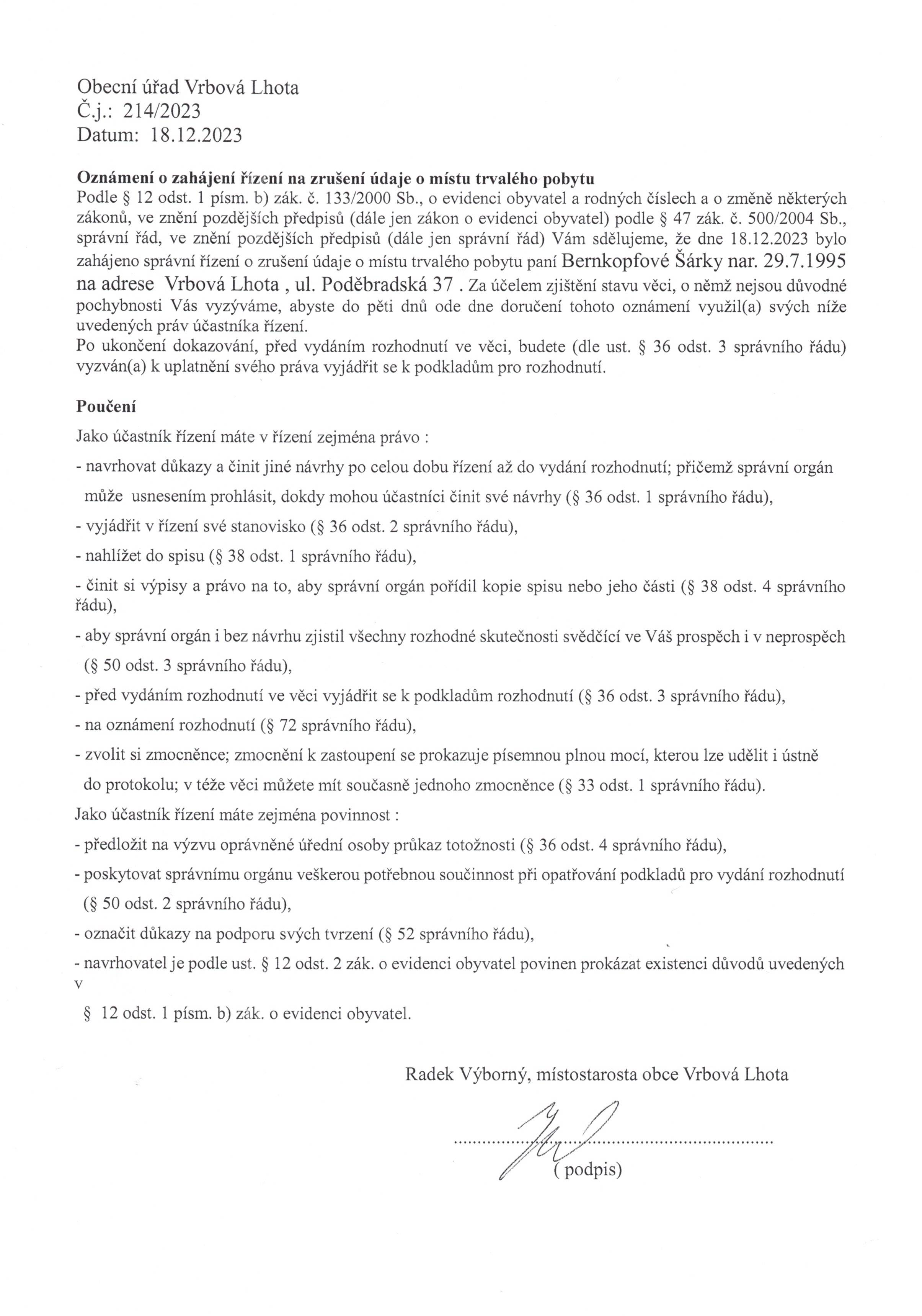 Oznámení o zahájení řízení na zrušení údaje o místu trvalého pobytu Bernkopfová Šárka.jpg (JPG 522.89 kB)