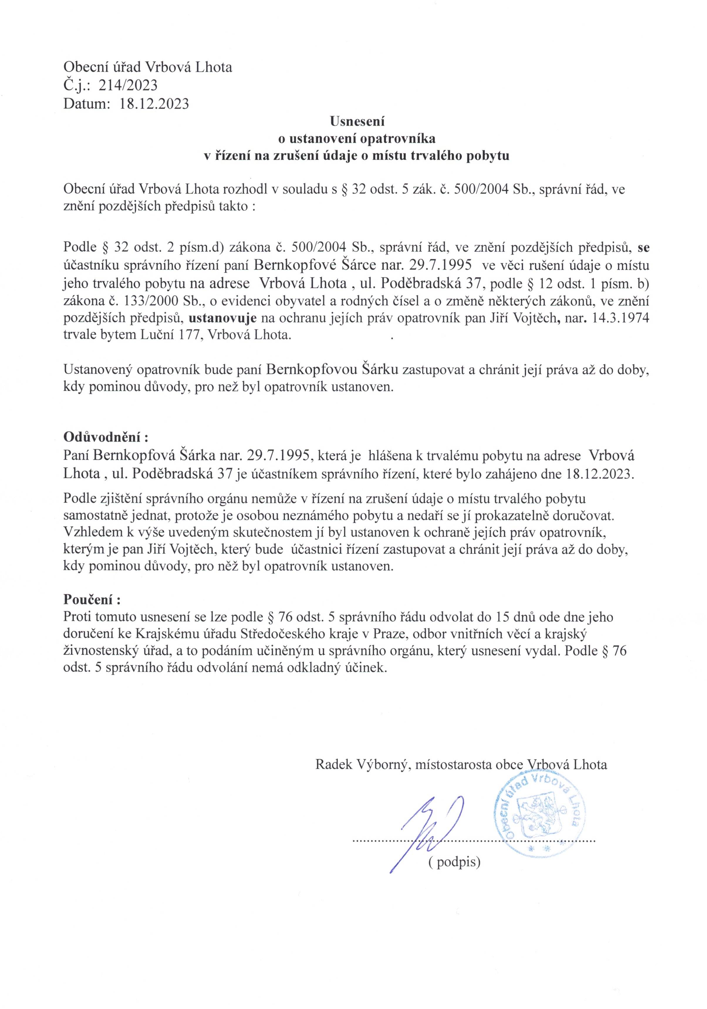 Připojené dokumenty:Oznámení o zahájení řízení na zrušení údaje o místu trvalého pobytu Bernkopfová Šárka.jpg (JPG 522.89 kB)