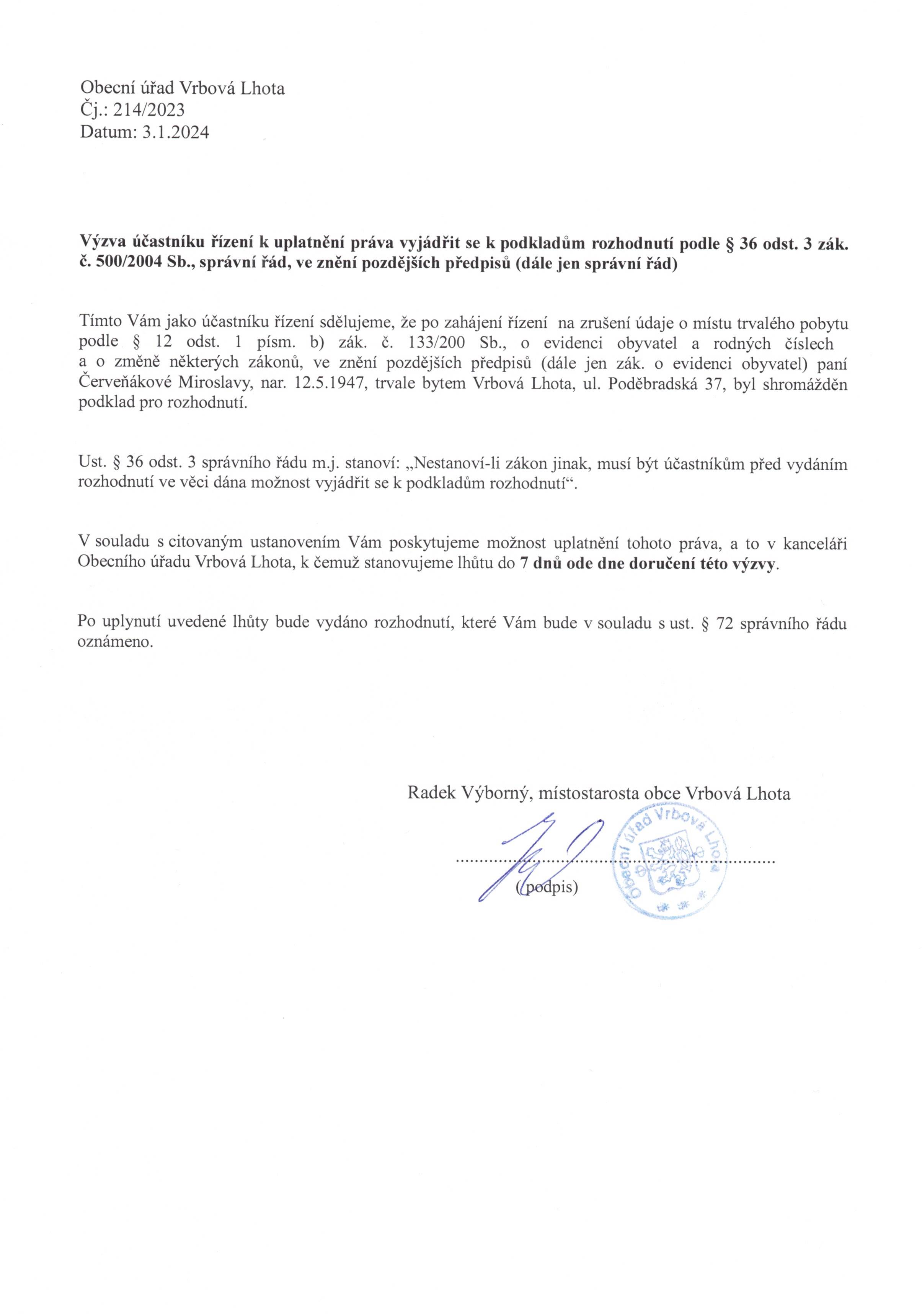Výzva k vyjádření se k podkladům pro rozhodnutí o zrušení trvalého pobytu - pí. Červeňáková Miroslava