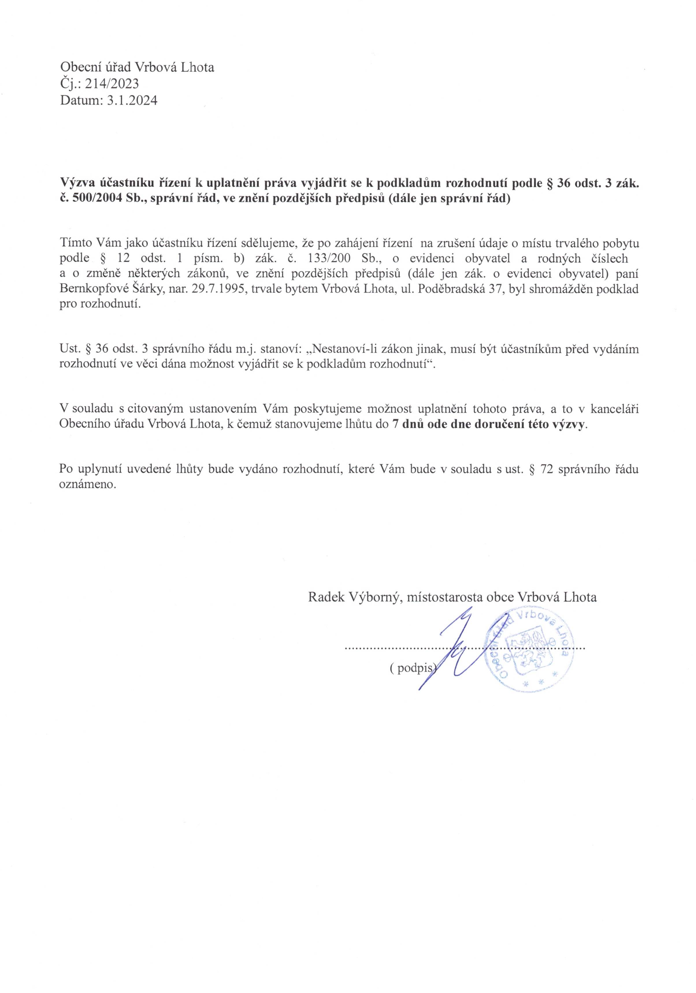 Výzva k vyjádření se k podkladům pro rozhodnutí o zrušení trvalého pobytu - pí. Bernkopfová Šárka