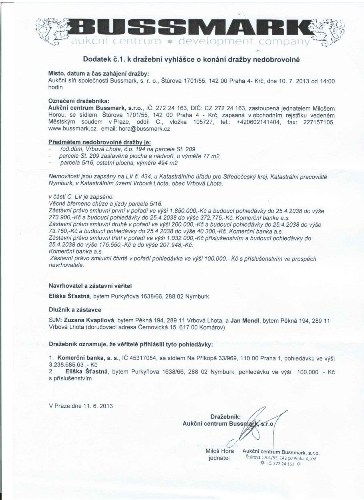 Dodatek č.1 k dražební vyhlášce o konání dražby nedobrovolné