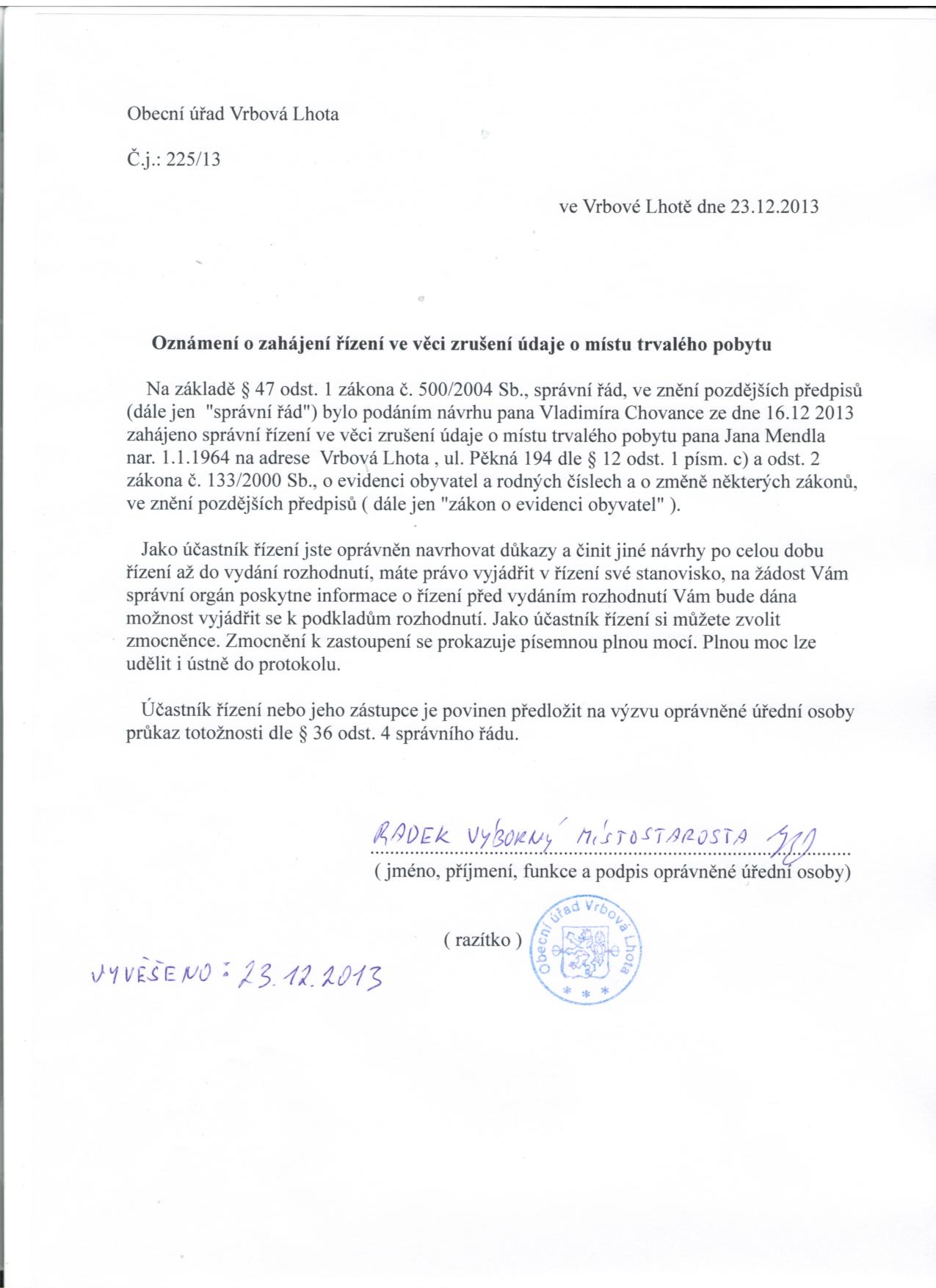 Oznámení o zahájení řízení ve věci zrušení údaje o místu trvalého pobytu - Jan Mendl.