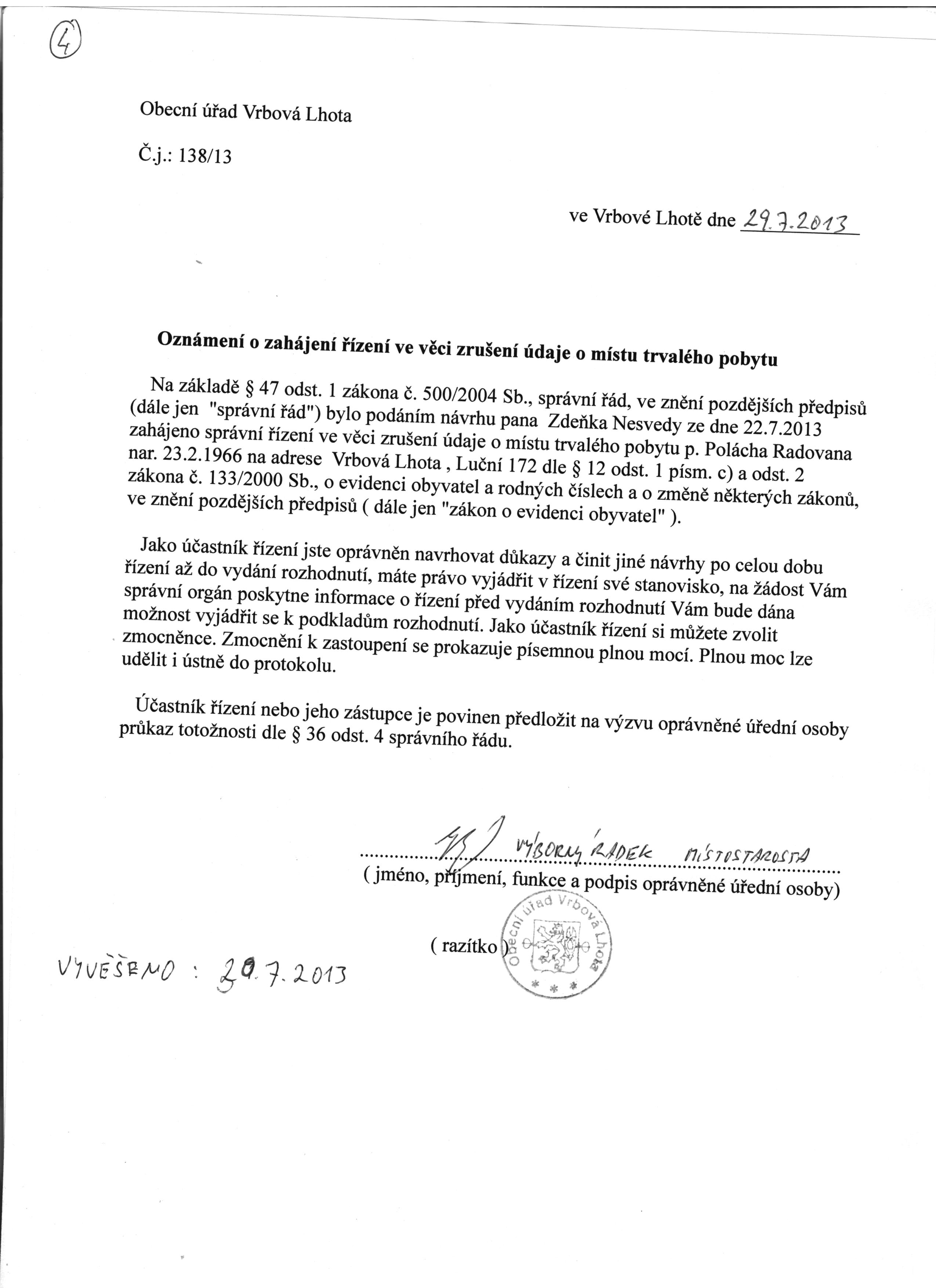 Oznámení o zahájení řízení ve věci zrušení údaje o místu trvalého pobytu - Polách Radovan