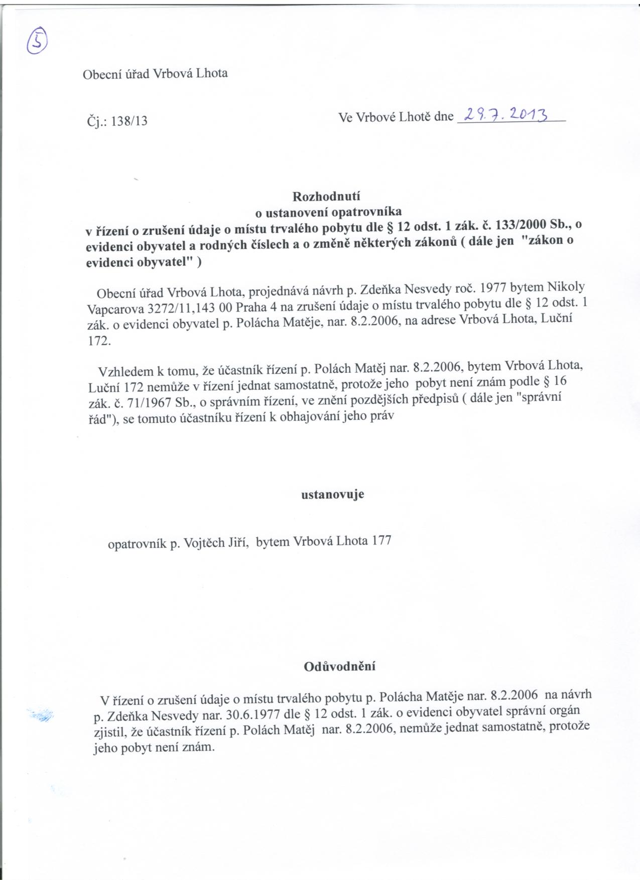 Rozhodnutí o ustanovení opatrovníka - Polách Matěj