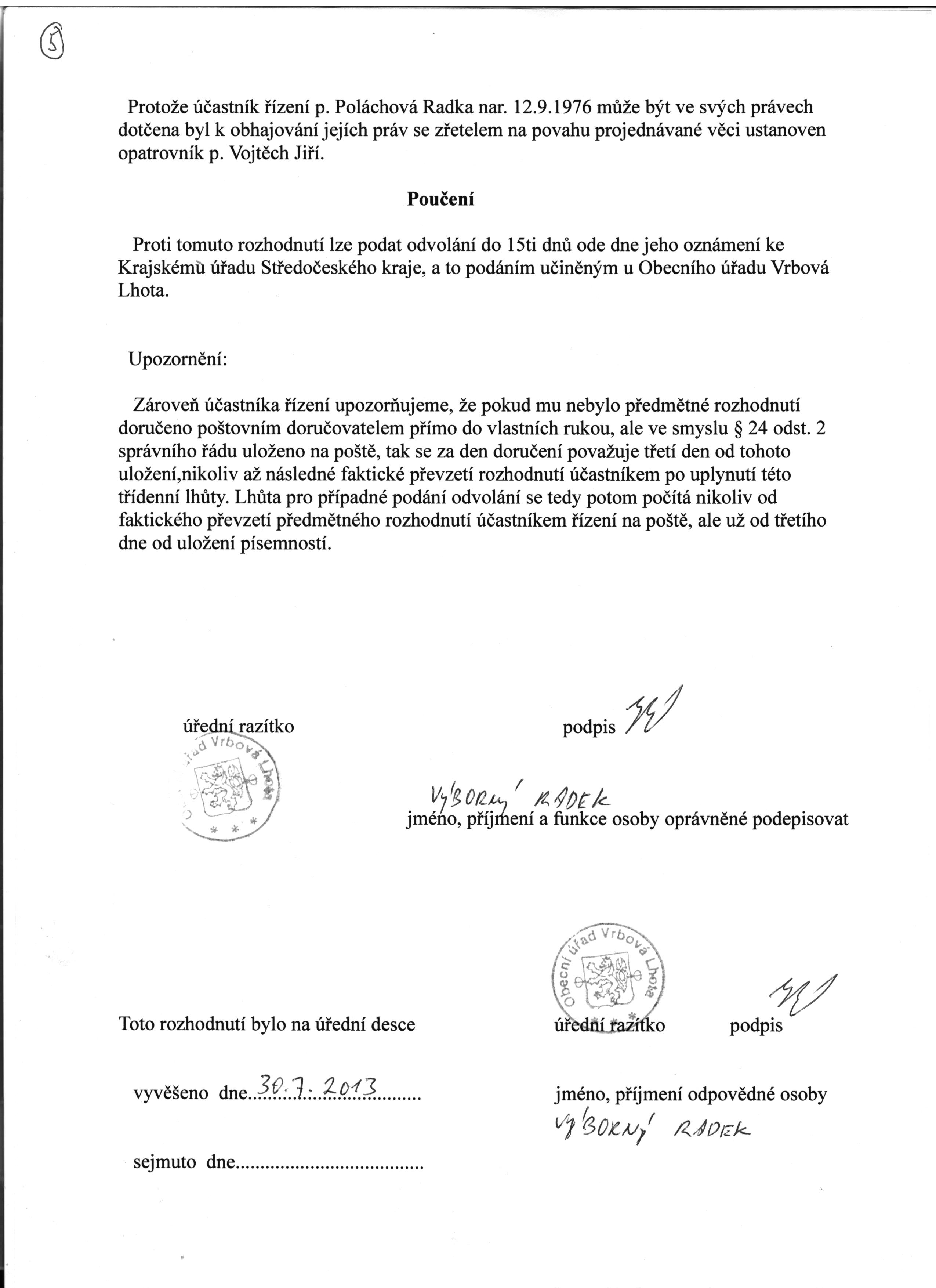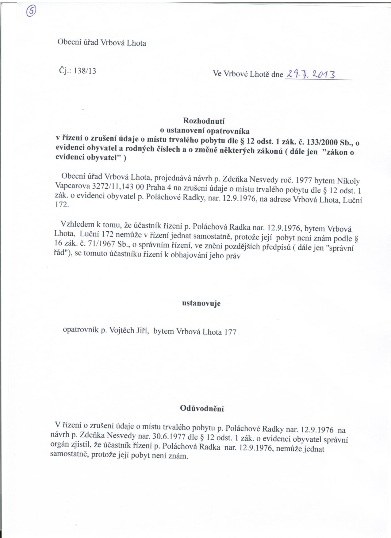 Rozhodnutí o ustanovení opatrovníka - Poláchová Radka