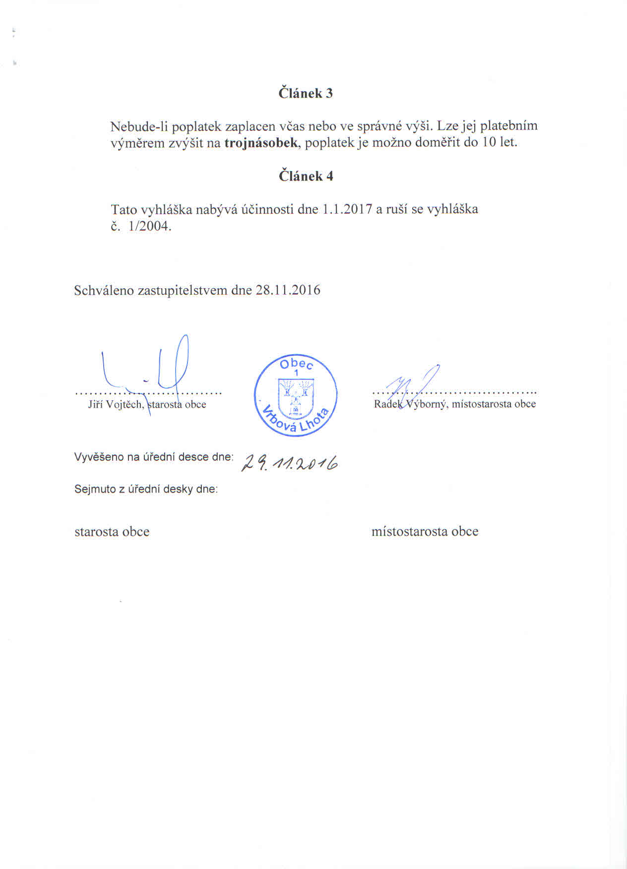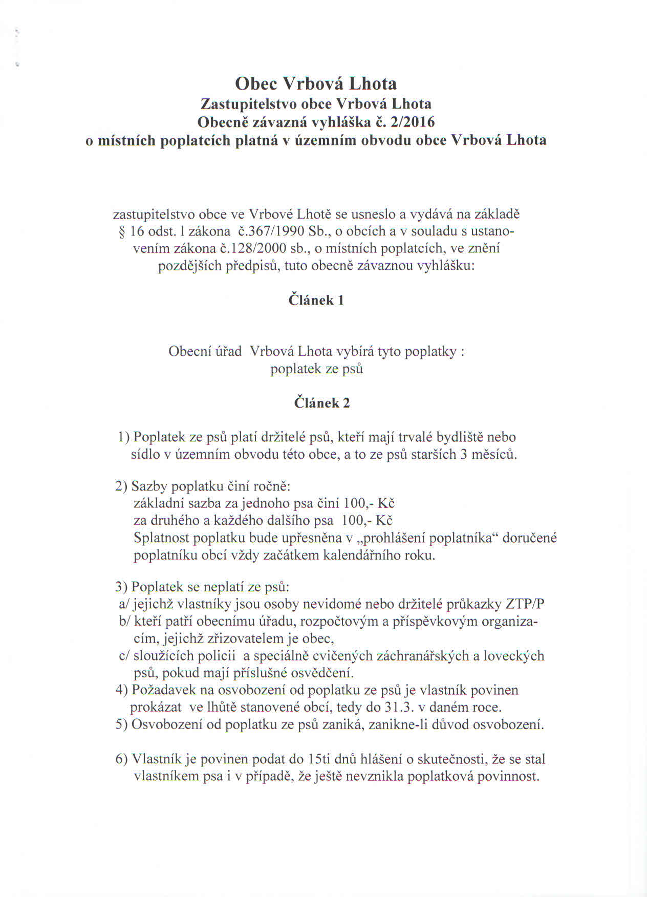 Obecně závazná vyhláška obce Vrbová Lhota č. 2/2016 o místních poplatcích platná v územním obvodu obce Vrbová Lhota