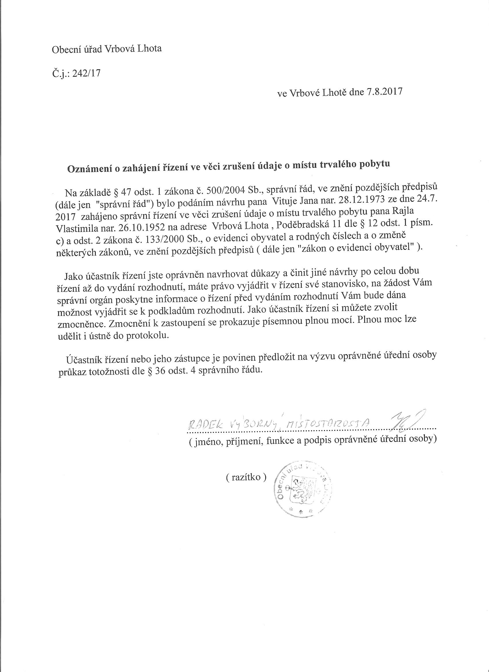 Oznámení o zahájení řízení ve věci zrušení údaje o místu trvalého pobytu - Rajl Vlastimil